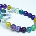 天然石・パワーストーンの銀座東道 素材で探す(ハ行) 素材で探す(ハ行)フローライト(蛍石)ブレスレット ブレスレット フローライト ブレスレット 10mm [T229-5418] 価格: ¥1,300 (税込) [ポイント還元 13ポイント~] 販売期間: 数量: 個 在庫: 1個 在庫 1個 返品についての詳細はこちら § 商品について §商品ID◆ t229-5418 重 量◆物重さ:約 32g ◆ 総物重(梱包前) 約 32g (本体、箱等を含む)商品サイズ◆内周:約165mm(±5mm) 粒直径:約10mm(±0.5mm)【フローライト(蛍石)】 フローライトは鮮やかなカラーのグラデーションが美しい天然石で、トルマリンに次ぐカラーバリエーションを持つとされています。 フローライトの中に白い羽のような内包物が入ったものは「エンジェルフェザーフローライト」と呼ばれ、普通のフローライトに比べて癒しの効果に特化しているとされています。 白い内包物の正体は未だに解明されておらず、アラゴナイトの一種やゼオライト、クォーツなど諸説あります。 フローライトはラテン語で流れるという意味の「fluere」が由来となっており、その言葉どおり滞っていた気の流れを整えて心身と環境のバランスを調和させるエネルギーを持つとされています。 また「天才の石」とも呼ばれ、思考力と記憶力、集中力を高めるとされており、クリエイティブな能力を引き出すといわれています。 緑は癒し、紫は浄化、青は知性、黄色は希望など、色合いによって持つ意味や効果に違いがあるともされていますので、期待する効果によってフローライトを選ぶのもおすすめです。 ⇒ フローライトをもっと詳しく ◆ワンポイント情報 フローライトは硬度が低く、一方向に割れやすい劈開性を持つため衝撃を与えないようにしてください。 また、紫外線や水分も褪色や劣化の原因となりますので保管の際も注意が必要です。 ▼出品商品の全ては産地から直接仕入れた新品ですが、天然の物ですので不純物や内包物、色むら、天然キズ、ひびがある場合がございます。また商品はできるだけ現物に近い色で撮影していますが、光源.カメラ.モニター画面により実物と色が若干異なる場合があります。▼物重さ、商品のサイズなどは測り方によって誤差が生じる場合があります。▼誠安では環境に配慮し最低限の簡易包装で商品をお届けいたします。